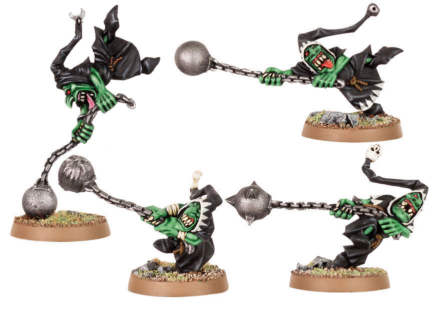 9 - Fanáticos Goblin Nocturnos: se que no es unidad, pero no podía resistirme a incluirlos en esta lista, y es que como no van a molar unos goblins que van prácticamente drogados a una batalla, debido a una cerveza hecho con setas, y que encima tienen esa actitud pendenciera que puede destrozar tanto unidades amigas como enemigas por igual. En cuanto a las minis he de decir que todas me gustan bastante, pero en esta caso me quedo con dos ediciones, los modelos de 4º y 6º edición, ya que ambos tienen mucha calidad, aun a pesar de su estilo tan dispar.