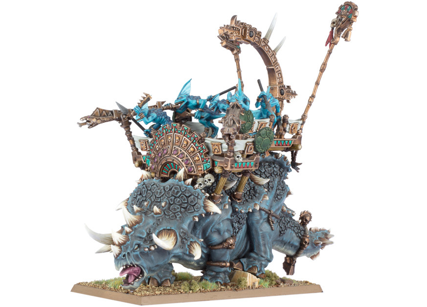 8 - Estegadón: y en la octava posición llegamos a las densas selvas de Lustria, para encontrarnos con una fortaleza andante llamada Estegadón que llevan existiendo desde tiempos anteriores a la llegada de los Ancestrales. Hay dos razones por las cuales he incluido a esta bestia en la lista, la primera es que el concepto de dinosaurio con un castillo encima lleno de eslizones hace que me parezca muy original y atractivo, el segundo es que el triceratops era mi dinosaurio favorito cuando era pequeño (de hecho me hice una colección de fascículos sobre el XD), como veis no siempre son motivos racionales XD.
