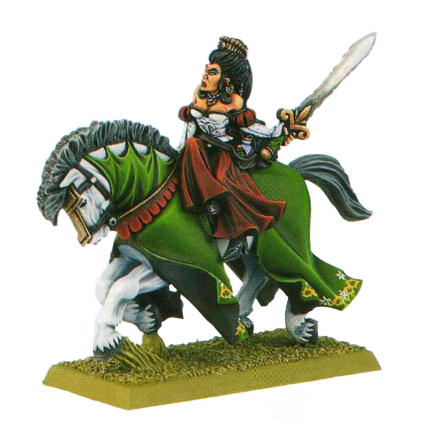 - Caballería ligera y pesada: aquí se percibe una gran diferencia sobre todo en el equipo, pues la ligera es más bien parecida a Herreruelos, Ellyrons o Hombres de armas, mientras que la Pesada son más del estilo Yelmos plateados, pero con la regla especial Orgullosos que le hacen ser inmunes a chequeos de pánicos, algo muy útil y diferente.